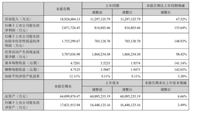 宁德时代半年报营收1892.5亿同比增长67.52% 利润207.17亿同比增长153.64%