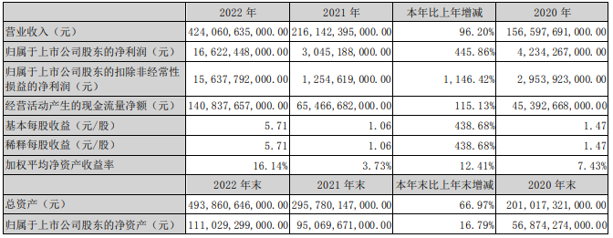 电子发烧友网报道(文/刘静)3月29日晚间,比亚迪发布《2022年年度报告》,报告显示比亚迪2022财年营收达到4240.61亿元,较上年同期增长96.20%;同时归母净利润达到166.22亿元,与上年的30.45亿元,增长了445.86%。