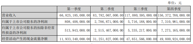 以季度来看,比亚迪第四季度创造最佳业绩,实现1563.73亿元收入,环比增长33.56%,同比增长120.40%。这一增速远超特斯拉当期营收的同比增速37%,以及环比增速13%。