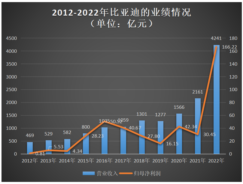 公告显示,2022年比亚迪实现营收4240.61亿元,归母净利润166.22亿元,营收冲破四千亿大关,净利冲破百亿大关。回顾过去十年,比亚迪的营收和净利增长的变化,如下图所示:
