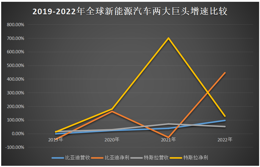 2019年特斯拉全球新能源汽车销量第一,比亚迪第二,这一排名直到2022年才发生改变。从增速这一点上,我们可以清晰看到比亚迪不断追赶特斯拉的身影。