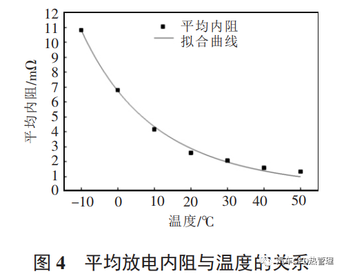 将不同环境温度下的内阻求平均值,如图 4 所 示。可以看出,电池平均内阻随着环境温度的升高 而下降。根据 Yazdanpour 等[13-14]关于内阻与温度之 间的关系,将电池平均内阻与温度拟合为