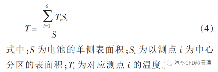 电池在放电过程中,电池极板上存在一定的温 差,由于绝大部分区域的温差不大(如图 5 所示), 所以将极板各测点值根据代表的中心区域比例取 平均,得出电池的平均温度,作为电池的温度,即