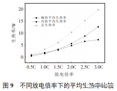 由式(3)计算出不同放电倍率下平均的内阻生 热率,根据计算得到的生热率(如图 6)算出熵热平 均生热率,并得到二者的比例关系。不同放电倍率 下的熵热平均生热率、内阻平均生热率和总生热率如图 9 所示。从图 9 中可以看出,随着放电倍率的 增大, 内阻平均生热率的增加大于熵热平均生热 率,在 0.5C 和 1C 之间熵热平均生热率大于内阻平 均生热率,在 1.5C~3C 之间内阻平均生热率大于熵 热平均生热率;在 0.5C 倍率放电时,熵热平均生热 率约占总生热率的 69%,3C 倍率放电时,熵热平均 生热率大约占总生热率的 36%。因此可以得出,熵 热在锂离子动力电池 0.5C~3C 倍率放电过程中约 占总生热率 36%~69%, 所以忽略熵热或熵热系数 而取定值会使模拟结果与试验有较大偏差。