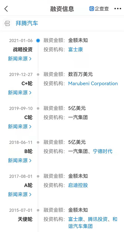 拜腾汽车的转机出现在2021年年初,根据企查查的数据,今年年初富士康参与了拜腾汽车的新一轮融资,金额不详。