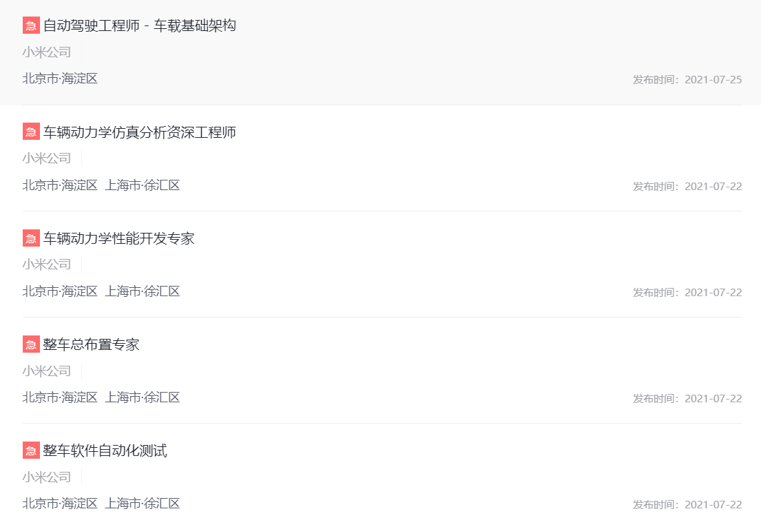 自7月22日开始,小米在其官方网站开始陆续发布多条汽车人才的