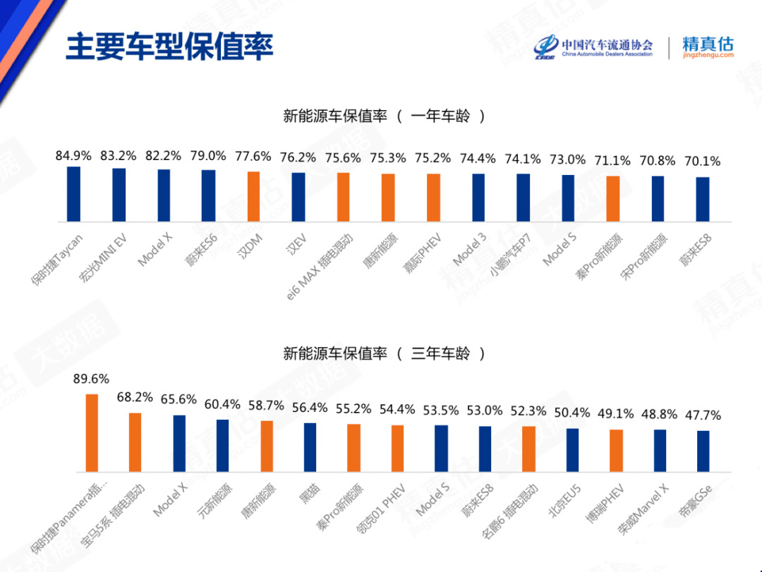 从具体车型来看,在纯电动车3年车龄保值率榜单中,