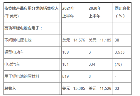 2021年上半年总收入为1,530.5万美元,较去年同期的1,152.6万美元同比增长33%。这主要是由于不间断电源电池销售收入与2020年同期相比增长了30%。随着我们继续加大对该市场的关注,不间断电源的电池销售大幅增长。