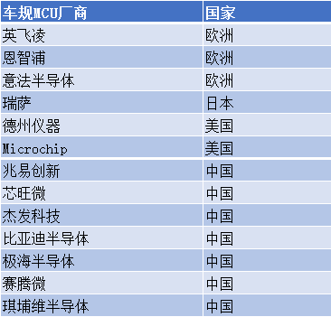 下面是电子发烧友整理的一张表格,里面涵盖了目前市面上主要的车规级MCU供应商,包括有数家国产MCU