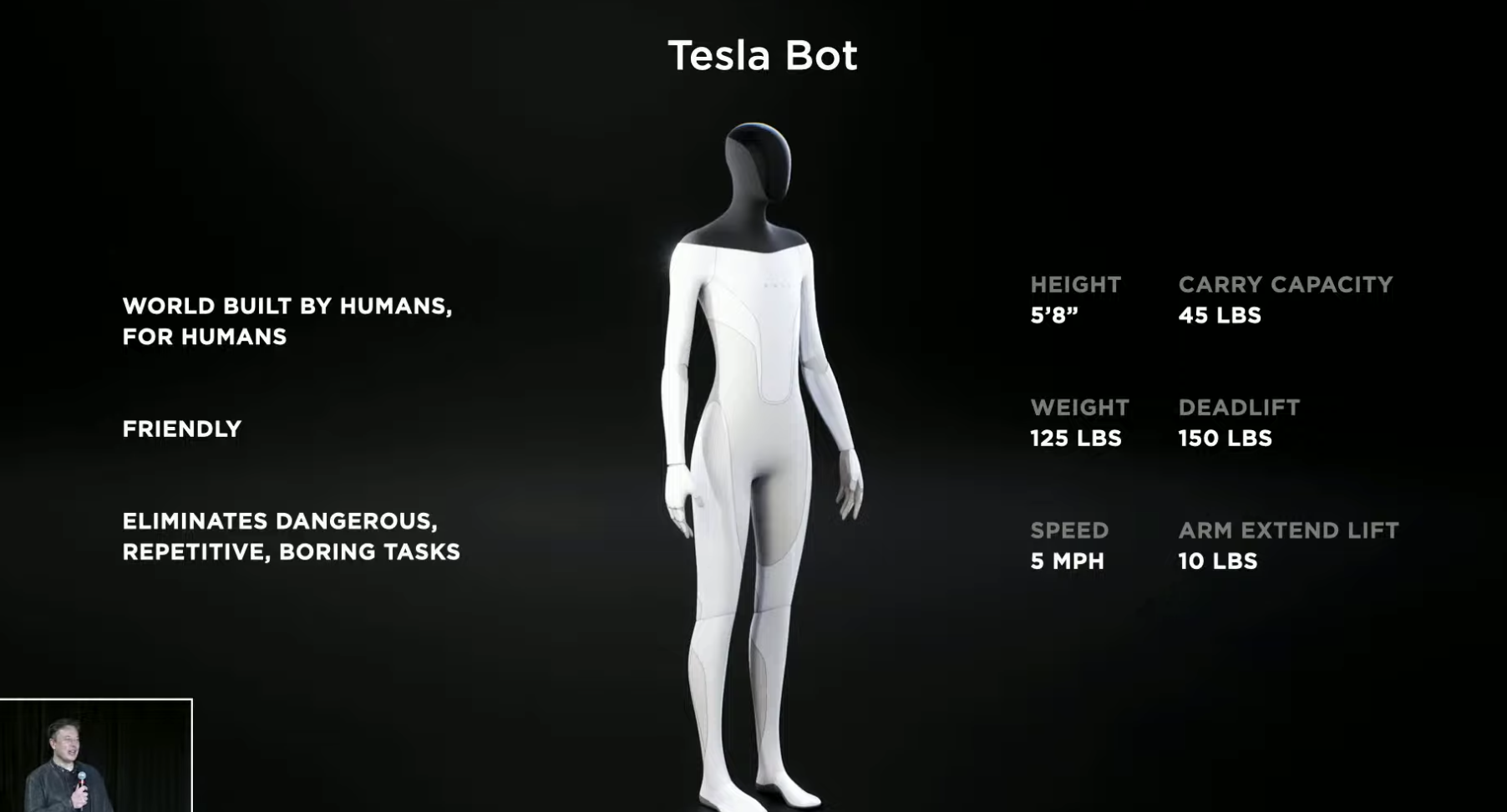 特斯拉机器人将作为一个服务型的通用机器人,帮助用户解决危险、重复而无趣的作业,所以它的结构参数至关重要。该机器人身高在1米73左右,可以承载20千克左右的重物,拉力达68千克,速度可至5英里每小时。马斯克还在现场开了个玩笑:“放心,这是一个友好的机器人,而且它是跑不过你的。”