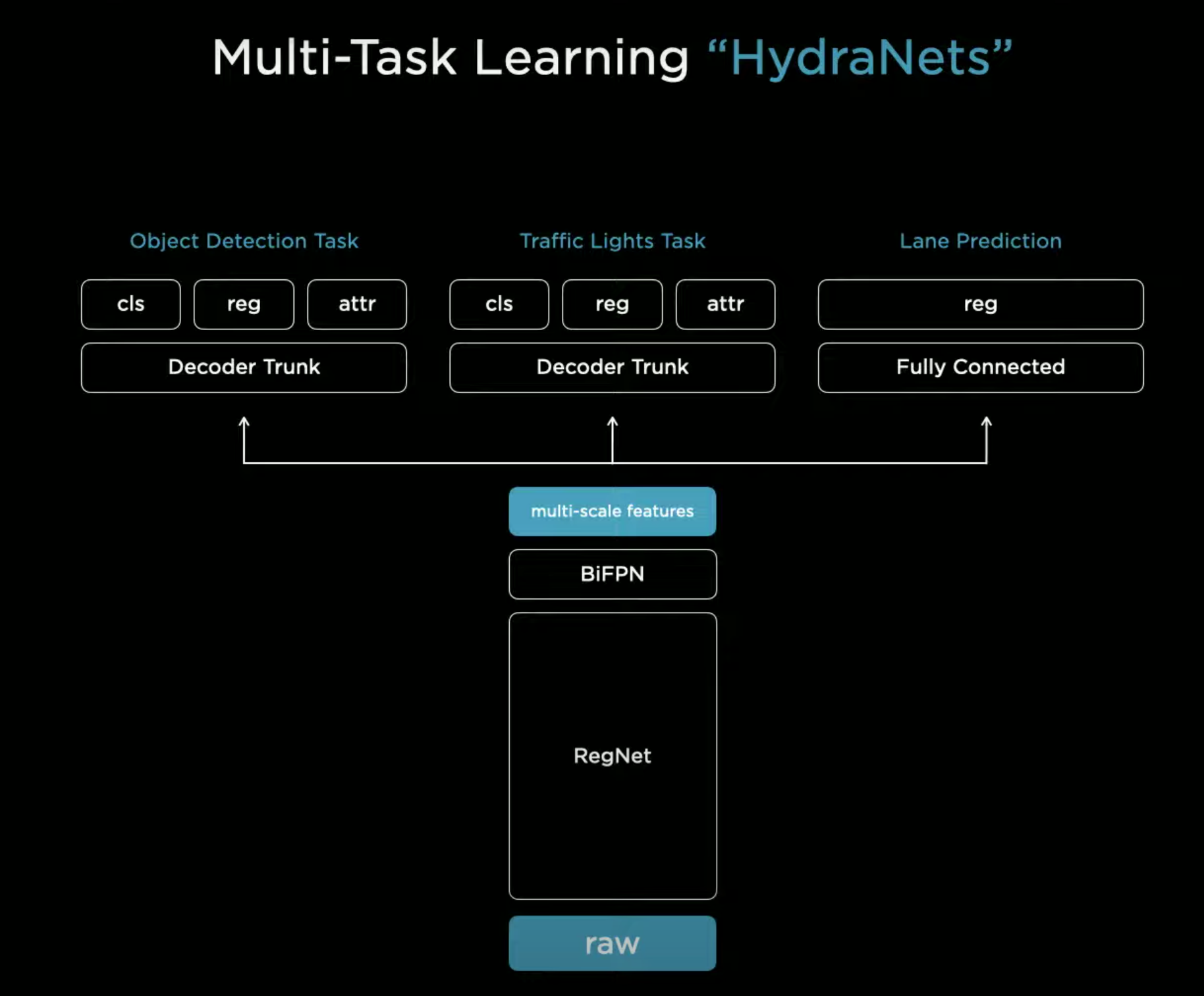 特斯拉也依此组建了多任务学习的“HydraNets”神经网络算法,用于物体检测、交通灯、车道预测等任务,这些任务可以共享功能,而且随时可以解耦。这么做不仅提升了效率,也可以对自动驾驶任务进行单独打磨,不必每次对算法进行大改。