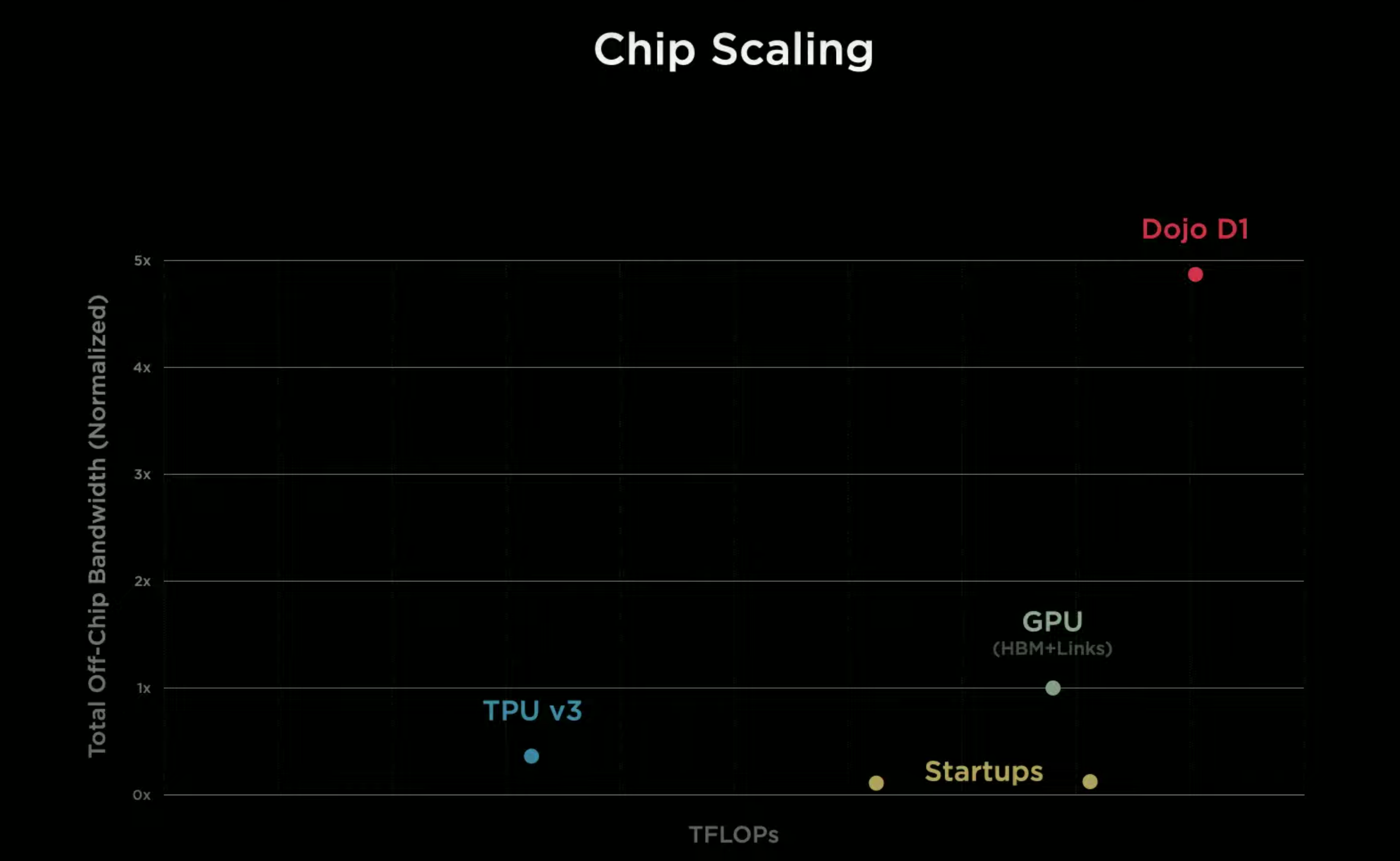 D1芯片与TPU、GPU和初创企业AI芯片的算力与带宽对比 / 特斯拉