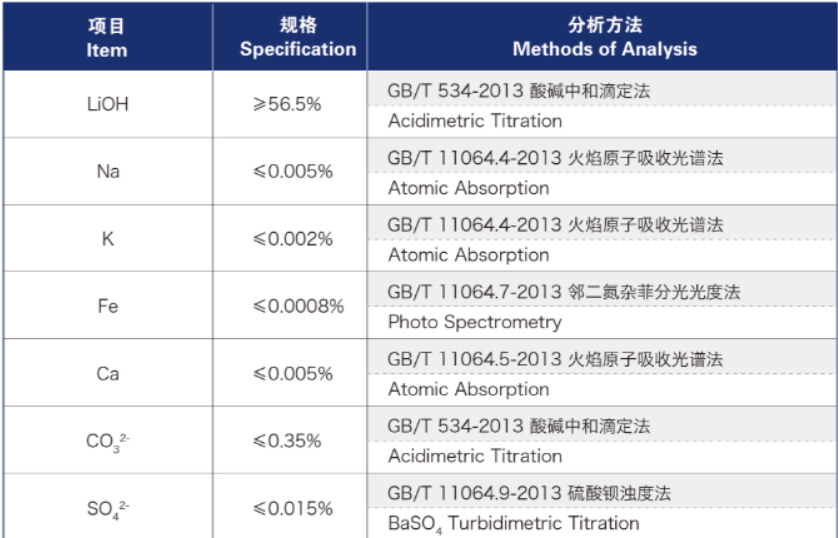 资料显示,天宜锂业为主要提供氢氧化锂、碳酸锂、金属锂、三元锂和磷酸铁锂等正极材料。在天宜锂业的官网,我们看到其提供的电池级单水氢氧化锂的成分表,其中氢氧化锂的含量≥56.5%。
