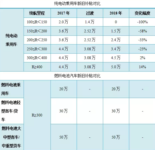 从以上补贴标准的对比可以看到,2018年国家提高了对纯电动乘用车的补贴门槛,且取消了低于150公里的低续航纯电动乘用车补贴。此外,续航里程在150公里以上(包括150公里),300公里以下的纯电动乘用车,相比2017年补贴标准进一步降低,而高于300公里(包括300公里)的纯电动乘用车补贴标准则有略微提升。尤其是,国家取消了低续航里程的纯电动乘用车的补贴,小幅度提升高续航里程纯电动乘用车的补贴。总体来看,国家对纯电动乘用车的补贴有退坡迹象。