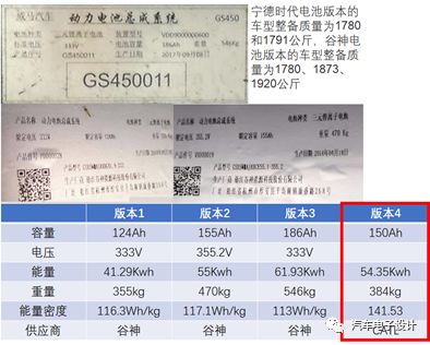 如下图所示,目前通过公告信息来看,已经上的是CATL两个备选的方案;谷神3个备选的方案。从这几个方案来看,用谷神的电池来为2018年的车型配套是不大现实的,能量密度几个方案都低于120Wh/kg,补贴也太低。而全部用CATL的,面临的问题是这款153Ah的电池系统的能量密度不算高,还需要升级,而且目前主流的北汽、广汽、上汽都是用的这款电芯来做的。一个是差异性不大,而且成本来看以威马2018年的供应量,我估计大概1万台不到,至少要1.4-1.5元/Wh。