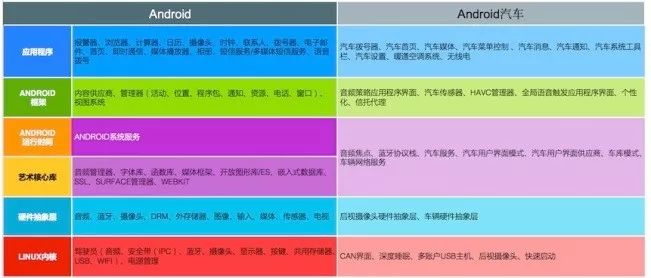 2015年开始,一些车厂开始使用安卓前装车载的信息娱乐系统,但当时的安卓只有移动和平板两个版本,各个厂家需要按需定制功能,在兼容性方面存在很大问题。2016年末,Android O、Android P新功能公布,在汽车方面涉及的模块,如下表所示。