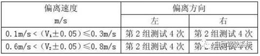 测试车道的曲率半径应在表1中相应类型曲率半径最小值的±10%范围内。测试车道应有足够长度以满足最小运行速度的需求(即类型Ⅰ20m/s,类型Ⅱ17m/s),这样车辆才能以0m/s﹤v ≤0.8m/s的偏离速度离开车道。