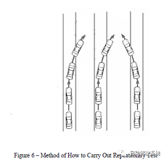 可重复性测试应在一段直线路段进行。车辆行驶速度根据表1中的系统分类选取,对于Ⅰ型系统选20m/s~22m/s,Ⅱ型系统选17m/s~19m/s。车辆可沿着车道中央行驶,或者靠近与车辆即将偏离越过车道标识相对的另一侧车道标识行驶。例如,如果将要向车道右侧偏离,则车辆可以沿左侧的车道标识行驶,反之亦然,如图6所示。当车辆按照指定速度沿测试车道跟踪行驶并达到稳定状态后,车辆可向车道左侧和右侧逐渐偏离。当偏离速度为0.1m/s﹤(V1±0.05)≤0.3m/s时,进行两组共八次测试(第一组的四次向左偏离,第二组的四次向右偏离);当偏离速度为0.6m/s﹤(V2±0.05)≤0.8m/s时,进行另外的两组共八次测试(第三组的四次向左偏离,第四组的四次向右偏离),即共需进行16次测试。V1、V2由设备制造商预先选择。测试系统应根据表4所示的偏离速度以组(每组四次测试)为单位顺次进行测试。