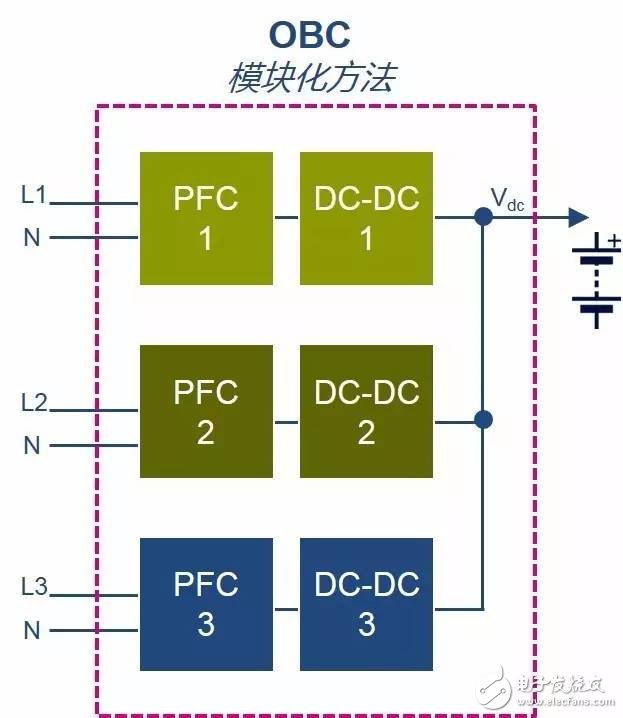 模块化方法3x(PFC + DC-DC)模块具有共同输入,可实现: