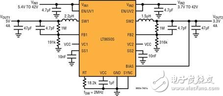 具低 EMI / EMC 辐射的双 DC / DC 转换器由于上述的应用限制,凌力尔特公司 (最近已被 ADI 收购) 开发了 LT8650S,这是一款能接受高输入电压的双输出单片同步降压型转换器,具很低的 EMI/EMC 辐射。其 3V 至 42V 输入电压范围使该器件非常适合包括 ADAS 在内的汽车应用,汽车应用必须稳定通过最低输入电压低至 3V 的冷车发动和停-启情况、以及超过 40V 的负载突降瞬态。正如在图 1 中能看到的那样,这是一款双通道设计,由两个高压 4A 通道组成,提供低至 0.8V 的电压,从而使该器件能够驱动目前可用和电压最低的微处理器内核。其同步整流拓扑在 2MHz 开关频率时提供高达 94.4% 的效率,而突发模式 Burst Mode®) 运行在无负载备用条件下保持静态电流低于 6.2µA (两个通道都接通),从而使该器件非常适合始终保持接通系统。