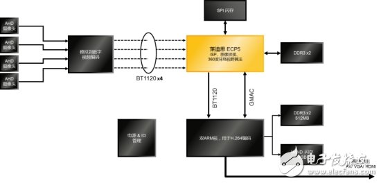 每个摄像头提供720p模拟高清图像。最终的环绕式全景视野解决方案的清晰度是1080p 60 fps。设计工程师使用一片低成本、低功耗ECP5 FPGA替代了多个ARM处理器。同时需要一个低端ARM处理器进行初始校准和视频编码。