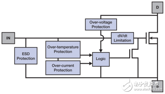 为了进一步因应瞬态,自我保护型 MOSFET (例如 Diodes 公司的 ZXMS6004FFQ) 采用完整保护的拓扑,包括过热保护及过电流保护电路。如图 3 的方块图所示,其中已加入过电压与 ESD 输入保护。此装置采用小尺寸 SOT23 封装,比同类 SOT223 封装的零件小 6 倍。