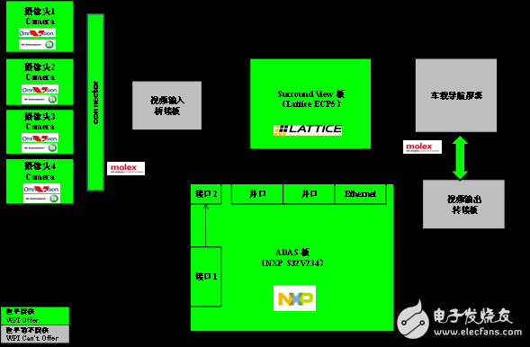 该方案采用了韩国算法公司MOVON的ADAS专利算法,360°全景环视部分采用了驰晶科技的全景算法和创新的CPU + Lattice FPGA架构。相较于其他ARM SOC平台解决方案,ARM + FPGA架构在实时视频处理、系统功耗降低、3D无缝融合、车辆的自适应能力上有很大的优势。