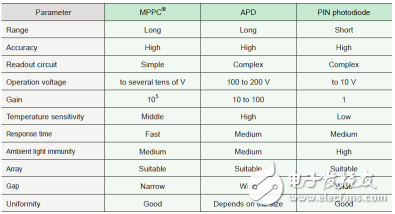 MPPC、APD和PIN光电二极管的比较