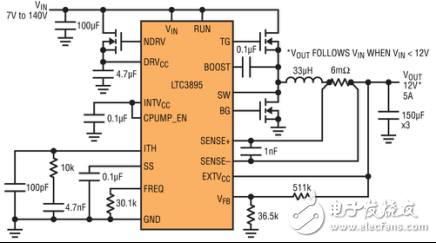 图 1 所示原理图在 7V 至 140V 输入范围内产生 12V 输出。当输入电压低于 12V 时,输出电压将跟随输入电压,因为该器件在顶端 MOSFET 连续接通时,会以 100% 占空比运行。由于 LTC3895 有内置充电泵,所以可以实现这种功能。