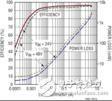 图 2 是图 1 所示 LTC3895 原理图在 24V 或 48V 输入电压时的典型效率曲线。如图所示,8.5V 输出产生非常高的 98% 效率。3.3V 时效率也超过了 90%。此外,这款设计由于突发模式运行,所以每路输出有 1mA 负载时,效率仍然超过 75%。