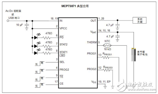 MCP73871 器件是一款用于系统负载均衡和锂离子/锂聚合物电池充电管理的完全集成线性解决方案,可以选择交流/直流墙式适配器或 USB 端口电源。此外,它还可以在输入电源和电池之间进行自主电源选择。该器件不仅物理体积小而且需要的外部元件少,因此非常适合于便携式应用。MCP73871 器件可以自动从单节锂离子电池或输入电源(交流/直流墙式适配器或 USB 端口)获取系统负载的电源。MCP73871 器件完全遵从 USB 规范规定的电流消耗限制。使用交流/直流墙式适配器为系统供电时,外部电阻将设置最大幅值为 1A 的充电电流,同时支持系统负载和电池充电电流之和最高为 1.8A 的总电流。