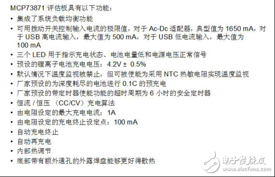 MCP73871 评估板能实现如Microchip 的分立式线性锂离子电池充电器的系统电源通路和负载均衡管理控制的解决方案。当断开输入电源时,锂离子电池也能给系统负载供电。