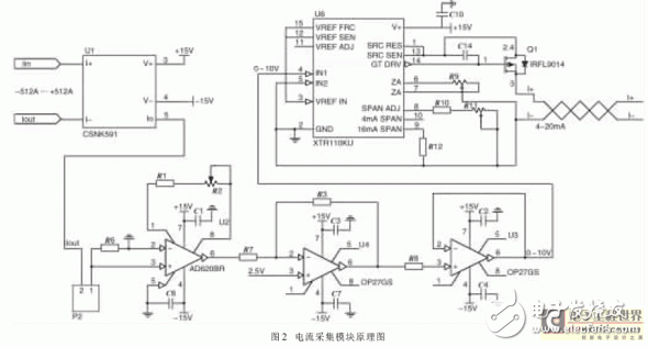 采集模块包括总线电流的采集、总线电压的采集两个部分,图2即为电流采集原理图。采用霍尔电流传感器隔离被测系统,比传统的基于电阻采样的电流分压电路精度高,安全性能好,抗干扰能力强。本文选用Honywell公司的基于磁补偿原理的霍尔闭环电流传感器CSNK591,测量范围±1200A,线性精度达到0.1%,总体精度达到0.5%,响应速度小于1μs,完全满足了系统的要求。采集信号经精密电阻转变为电压信号,再由仪用放大器放大为±5V双极性电压信号。系统选用AD620BR仪用放大芯片,该芯片在增益较低时具有较大的共模抑制比(G=10时,共模抑制比最小为100dB),能较强地抑制由于温度、电磁噪声等因素引起的共模干扰。放大信号通过OP27GS芯片抬升至0~10V单极性信号,经过射极跟随器送至变送器XTR110KU,转为4mA~20mA的电流信号送到中央处理模块。之所以将采集信号转变为4mA~20mA电流信号,是考虑到与工业接口标准的统一,并且采用电流传输抗干扰能力强。