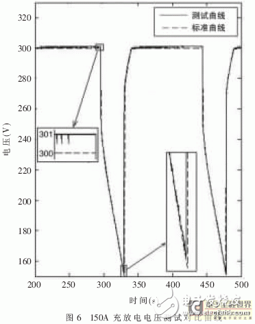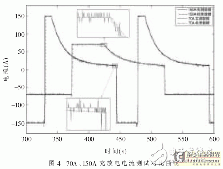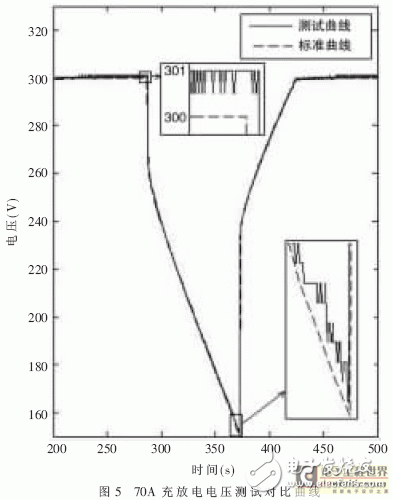 图4、图5、图6给出了两种情况下的测试曲线对比。其中,图4表示70A和150A两种标准测试情况下,电流的变化曲线。图5、图6表示两种情况下,电压曲线特性。可以看出两者的匹配程度很好。电压测试精度高于电流测试精度,这是由于一方面充放电系统本身电压比电流控制精度要高,另一方面电流传感器安置在电容箱体内并且紧靠单体电容,电容充放电时产生的噪声干扰比较严重。同时,霍尔电流传感器孔径较大,穿过电流总线后仍有一定空隙,在一定程度上影响了测试精度。对比各组电流曲线,可以看出随着电流的增大,测试结果的相对误差减小,但绝对误差保持一致,不超过3A。