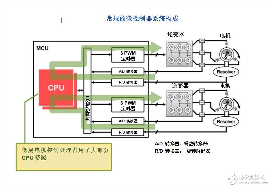 因此,不仅需要对电机进行机械性改进,提升电机的电子控制单元的功能和性能也十分重要。可用于支持下一代电动车、混合动力车以及插电式混合动力车的电子控制单元需要非常领先的功能和复杂的控制软件,而这势必会大幅增加这些电子控制单元中的微控制器的处理负荷。与此同时,为确保在高温环境中的高度可靠性,还需要限制汽车微控制器产生的热量。因此,需要将微控制器的内部电路(包括CPU内核)的操作频率保持在相对较低的水平,而这会妨碍其性能的提升。