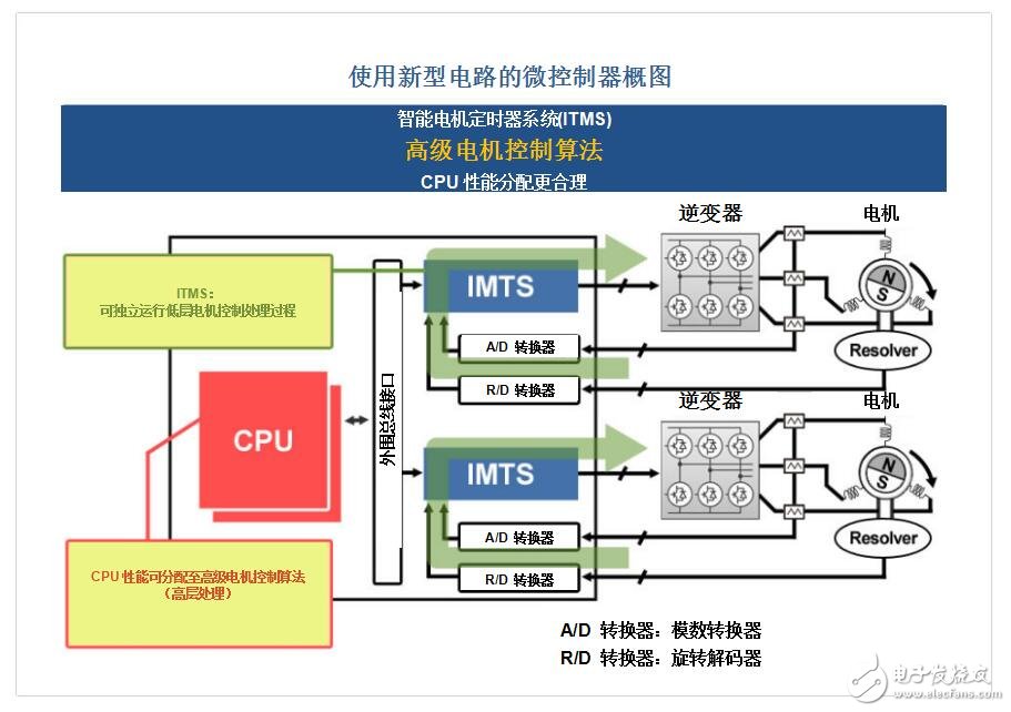 为满足上述需求,在微控制器执行的众多电机控制中,瑞萨电子将IMTS作为静态处理的专用电路模块,因为该处理过程通常需要高反应性能,如采集传感器数据,在此基础上计算并输出控制值等。IMTS独立于CPU,可自主运行,可显著降低电机控制微控制器的CPU负荷。节省下来的CPU性能便可以分配至高级电机控制算法上,从而提高未来电动车、混合动力车和插电式混合动力车的能源效率。