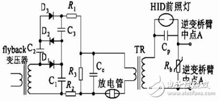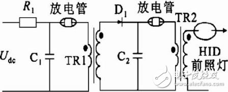 启动期间,电子镇流器要经历高压击穿、电流接续、预热维弧3个阶段。高压启动电路是HID 前照灯能否瞬间点亮的基础。但辉光放电后惯性和滤波延迟使直流变换器和检测回路很难有较快的响应速度,所以需要如图1所示的电流接续(take-over) 电路,它可利用电容预先储存的能量为灯提供一个较大的瞬间电流(约300ms) ,保证辉弧可靠过渡。一般高压发生电路有以下几种:
