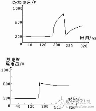 一旦Cc 的端电压使放电管击穿,将Cc中的能量转移到高压变压器的副边,在灯端产生高压,其电压值由变压器副边的电感和电容、灯状态及压敏电阻和线路电阻所构成回路的时间常数决定。
