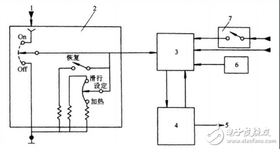 (1-电源,2-主控开关,3-巡航控制ECU,4-执行器,5-接节气门,6-车速传感器,7-制动灯开关)