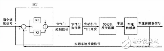 在控制过程中,当实际车速低于驾驶员设定的巡航车速值时,巡航电控单元 CCS ECU 将向执行机构发出增大节气门开度的指令,使实际车速升高到巡航车速。反之,当实际车速高于驾驶员设定的巡航车速值时,巡航电控单元 CCS ECU 将向执行机构发出减小节气门开度的指令,使实际车速降低到巡航车速,从而使实际车速基本保持驾驶员设定的巡航车速值不变。