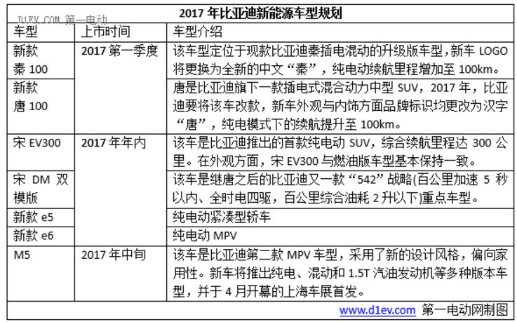 2017年目标:2017年继续保持同行业的增长速度,以颠覆用户体验感受、服务用户营销服务,保持新品如秦100、唐100、宋DM、宋EV、元DM等有节奏的推向市场。