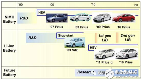 丰田自1997年率先量产其混合动力汽车Prius以来,便一直在混合动力汽车市场占据绝对的领导地位,2003、2009年又发布了Prius二代和三代,不过都是使用的NiMH电池。直到2011年Prius Alpha,开始使用锂电,此时的锂电池为一代锂电池。在2016年,第4代Prius,丰田开始使用最新的二代锂电池。