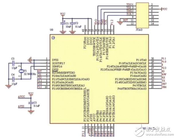系统的主控电路图如图2所示。本系统中选用的MSP430F2274片内有32Kb 闪存和1KbRAM,因此无须外扩存储器。外接的32.768kHz 晶振作为CPU 关闭状态Basic-Timer 的时钟源,同时也作为系统的车载时钟使用。