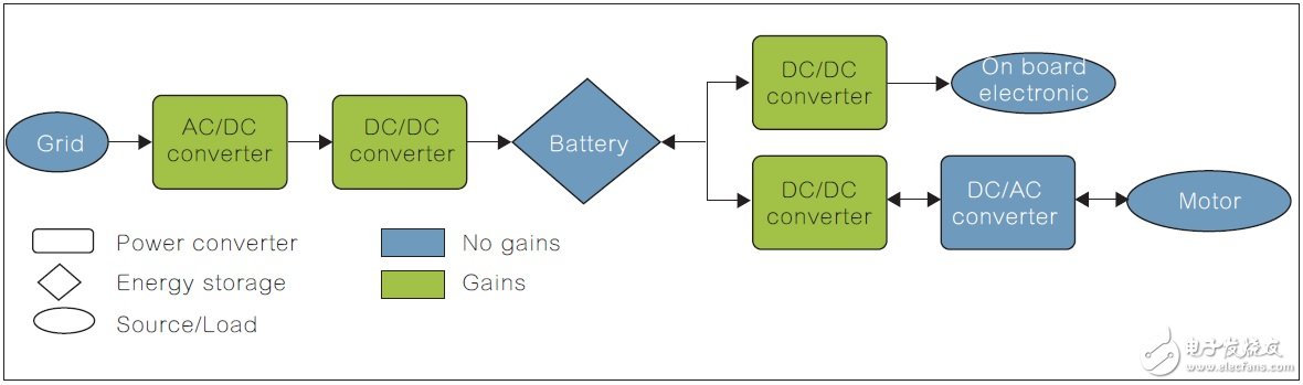SiC 组件在电动汽车中有许多关键应用。现有的电力牵引驱动装置能够将85%的电能转换为机械动能以驱动车轮,这个效率是相当高的,但SiC也能协助提高效率。电能转换器能受益于效率的改进,因为它能将电池能量传递给发动机,而且能在电池充电器电路和任何需要的辅助电源中使用(图1)。