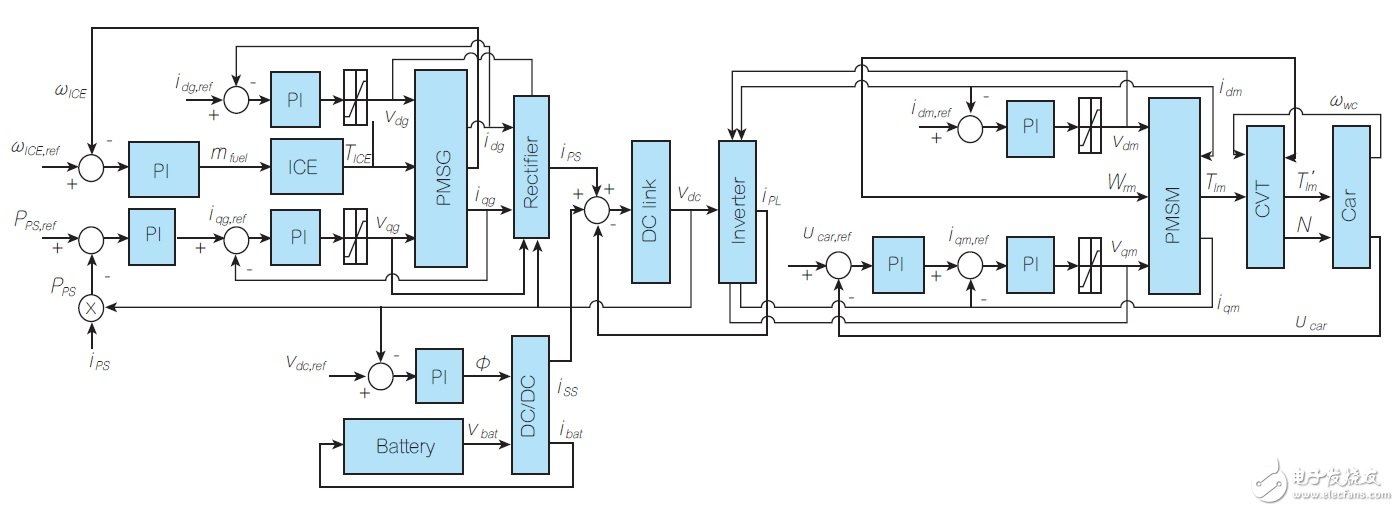 图4 控制原理图中的混合动力汽车传动系统互连图。引擎(ICE)、连续可变变速箱(CVT)、永磁同步马达(PMSG)或混合动力汽车的初级电源、永磁同步马达(PMSM)或混合动力汽车的推进负载都是图中所示系统的关键组件。