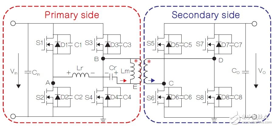 图7 设计师有时使用调制过的DAB转换器控制简单高频隔离,这种架构的优势是组件的应力较低;其主要缺点是,ZVS无法扩展到整个输出范围,特别是在轻负载条件下。这张图显示,升压系列谐振双向转换器是一种更好的架构。