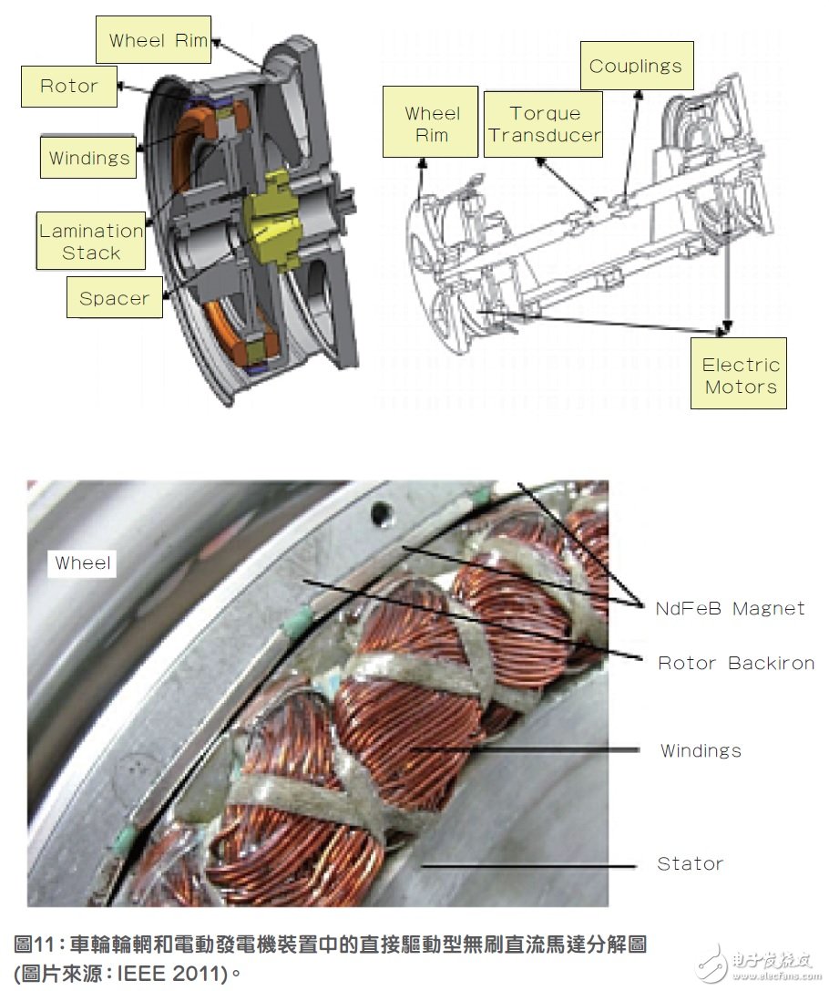 图11 车轮轮辋和电动发电机装置中的直接驱动型无刷直流马达分解图。