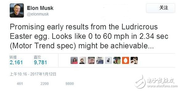 不过,自己原来的加速纪录被超越,特斯拉显然也不会干瞪眼。今天,特斯拉CEO马斯克在Twitter上表示,从最新的Model S P100D(疯狂模式)的表现来看,其0-60英里加速已经可以达到2.34秒。这句话显然很容易让人想到之前和法拉第FF91的加速比赛。