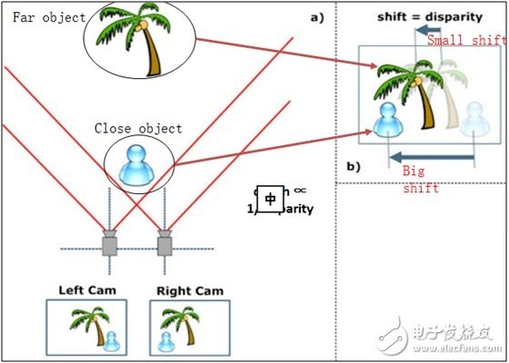 双目摄像头的原理与人眼相似。人眼能够感知物体的远近,是由于两只眼睛对同一个物体呈现的图像存在差异,也称“视差”。物体距离越远,视差越小;反之,视差越大。视差的大小对应着物体与眼睛之间距离的远近,这也是3D电影能够使人有立体层次感知的原因。