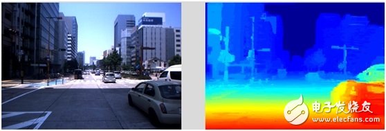 另一个难点在于双目的配准效果。通过双目摄像头的图像配准可以计算生成表示距离的二维图像。下图是中科慧眼双目方案对实际场景信息采集与计算得到的距离的对应关系,不同饱和度颜色代表不同距离,从暖色调至冷色调为距离由近及远。在计算过程中,需要对噪点与空洞做很好的抑制。从右图可以看出,色调(距离)是平滑过渡,没有跳变。